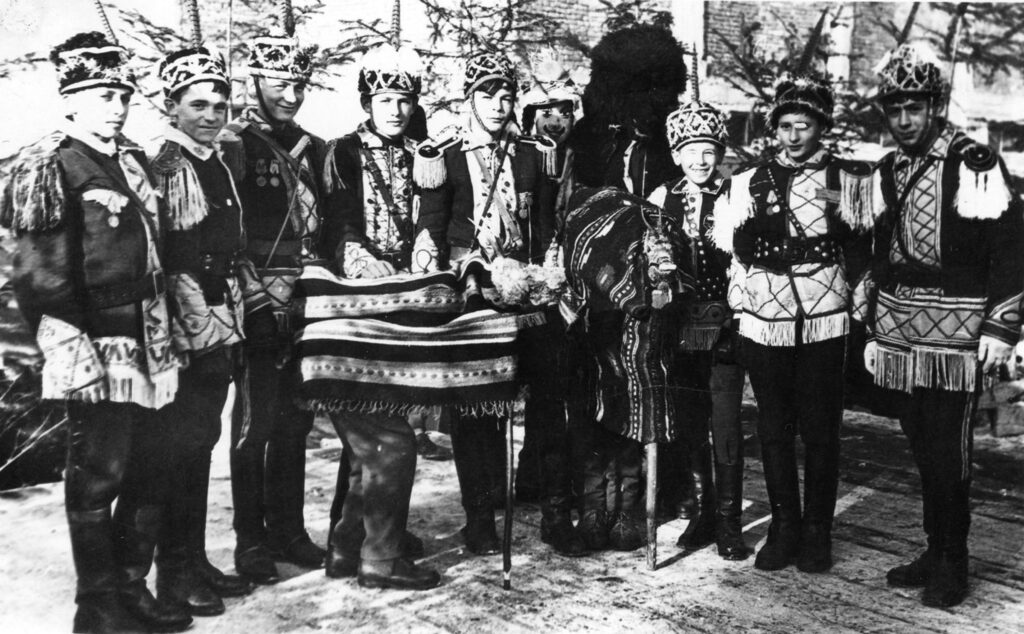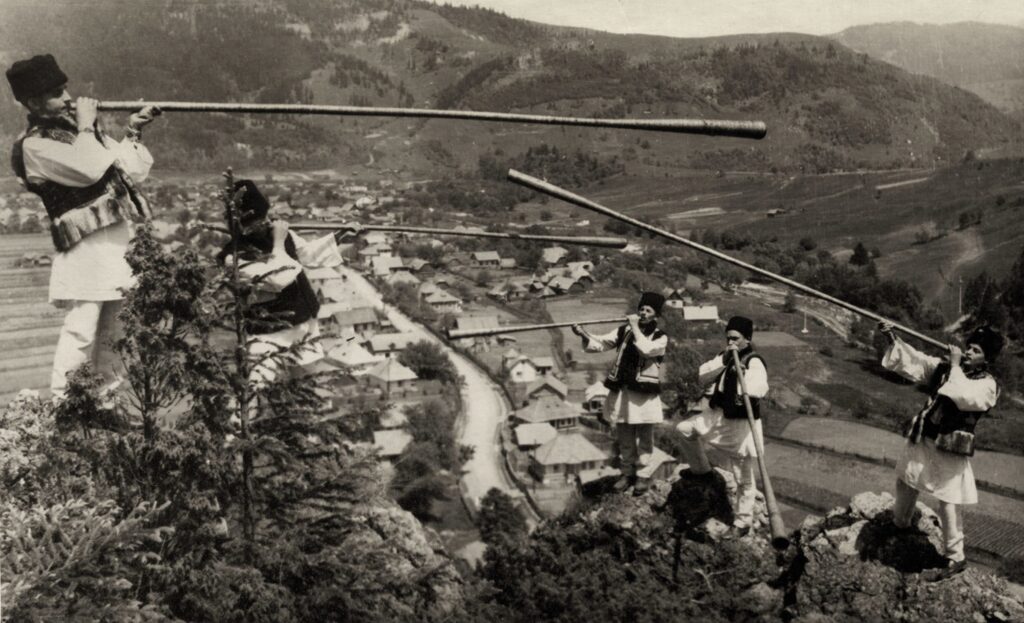 Buciumași din echipa meșterului Mihai Lăcătâș, pe stânci, pe Izvorul Alb, față în față cu Piatra Buhii.