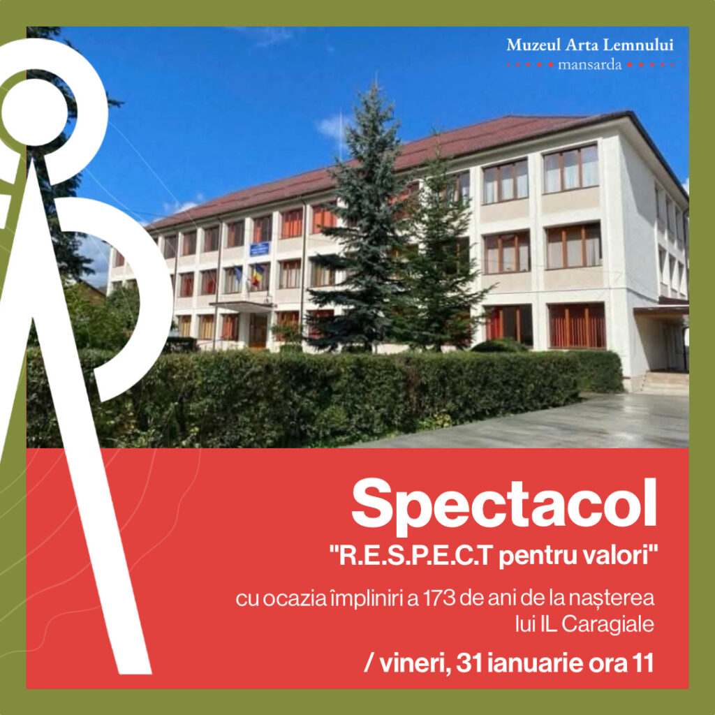 Vineri, 31 ianuarie, de la ora 11, vă invităm la spectacolul elevilor Școlii ,,Theodor Ștefanelli”, organizat cu prilejul campaniei ,,R.E.S.P.E.C.T pentru VALORI” și a împlinirii a 173 de ani de nașterea dramaturgului Ion Luca Caragiale.