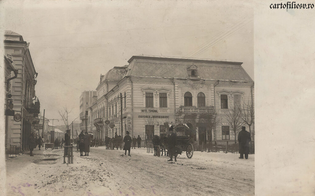 Centrul (zona palatului comunal) , înainte de al doilea război mondial. Se observă autobuzul parcat în fața restaurantului central.