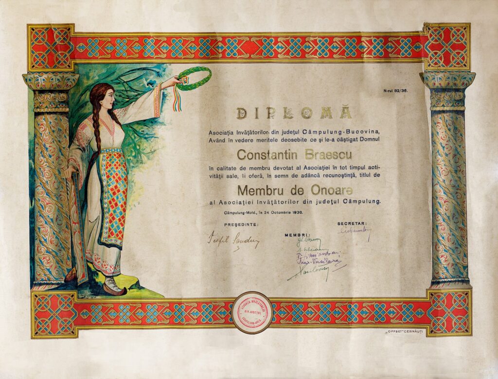 Diplomă acordată domnului Constantin Brăescu din partea Asociației Învățătorilor din județul Câmpulung-Bucovina