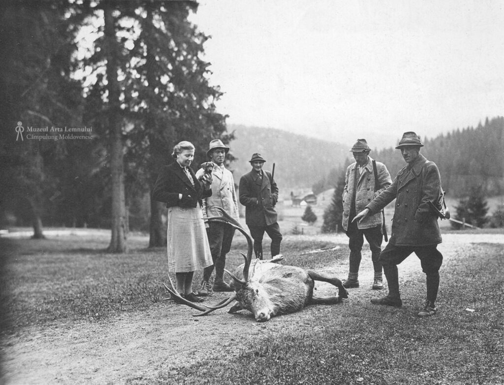 Pe peluza Castelului regal de vânătoare din Poiana Ițcani, cu cerbul-trofeu.