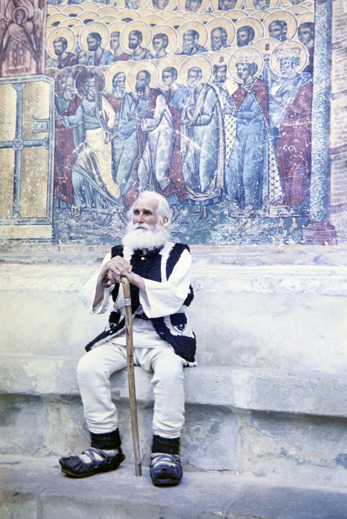 Gheorghe Mîndrilă, veteran din cel de-al Doilea Război Mondial, obișnuit al Mănăstirii Voroneț în deceniul al optulea al veacului trecut. Trecut în neființă în 1977.Film negativ Agfacolor LCN17 medium format. Autor: Ferdinand Michitovici. Clișeu donat MAL de familia Postelnicu.