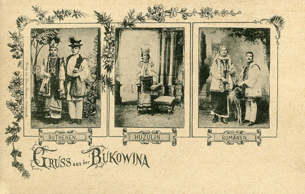 Carte poștală care ilustrează trei dintre naționalitățile Bucovinaie la început de secol XX: rutenii, huțulii și românii.