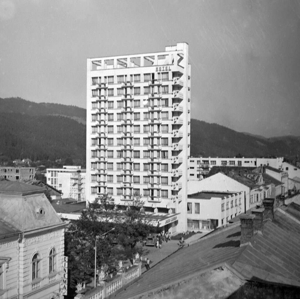 Hotelul Zimbru, după inaugurare. În plan secund, Policlinica orășenească, cu schelele încă nedemontate și blocul din spatele acesteia, în construcție.