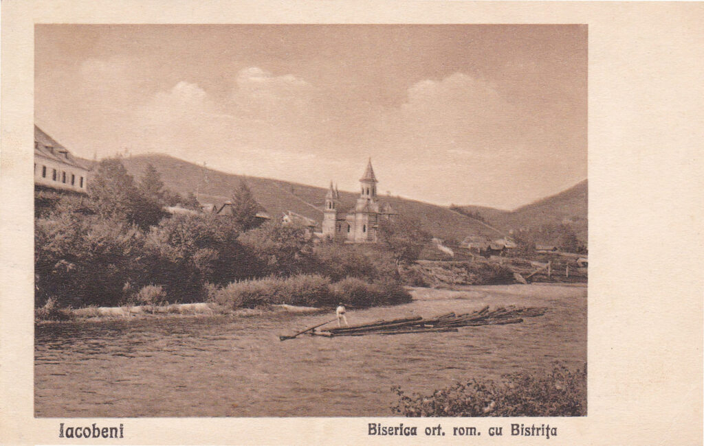 Iacobeni. Biserica Ortodoxă (construită în perioada 1907-1913) și plute pe Bistrița Aurie