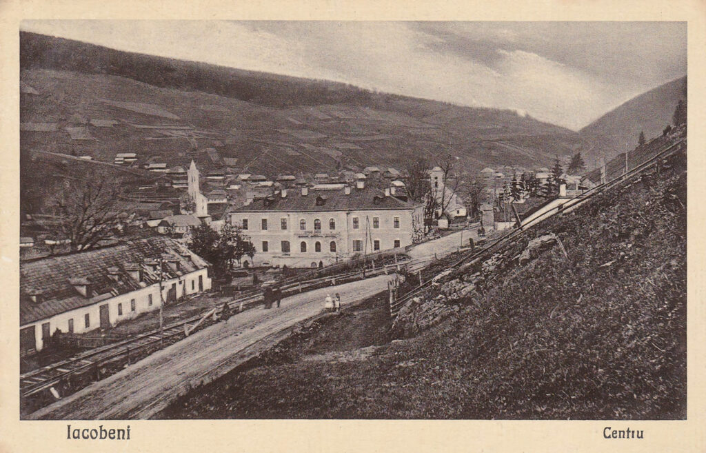 Iacobeni. Centrul, cu Biserica Evanghelica și Biserica Romano-Catolică