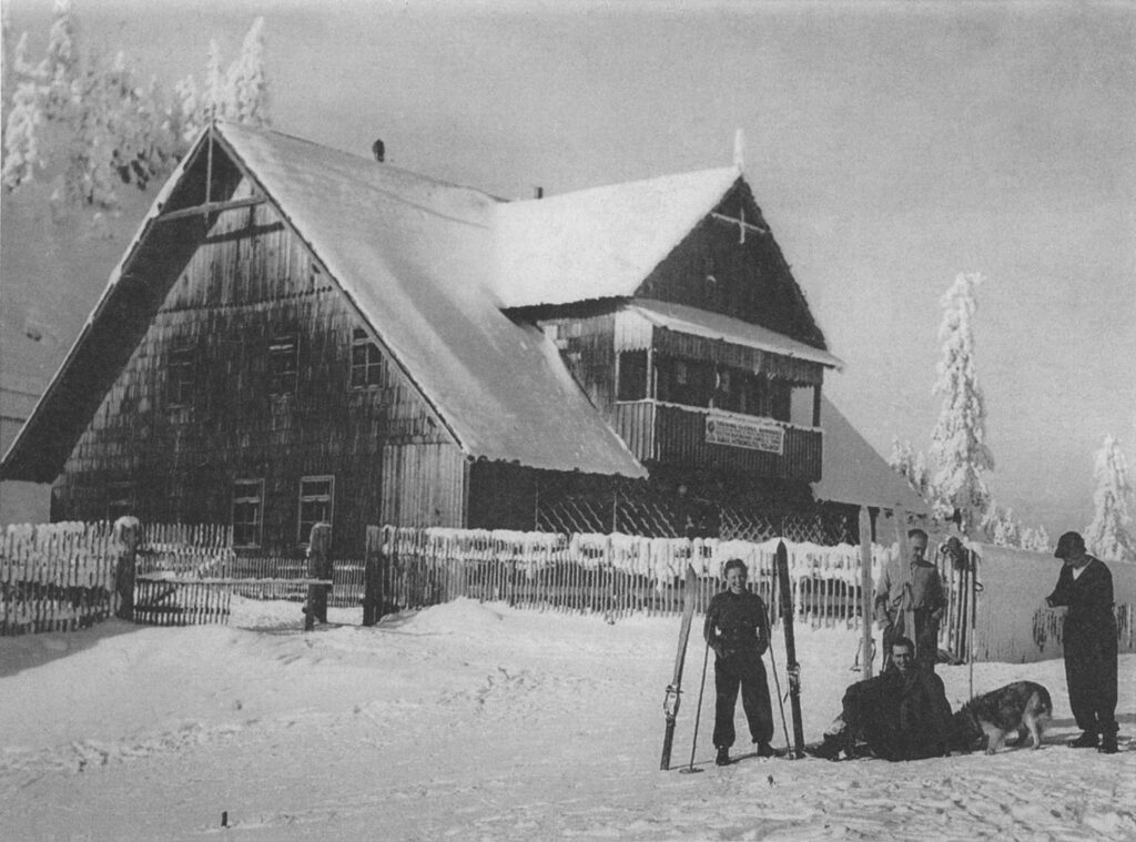 Iarna 1937/1938 pe Rarău. Cabanierul Victor Heckl Cocoreanu, împreună cu turiștii.