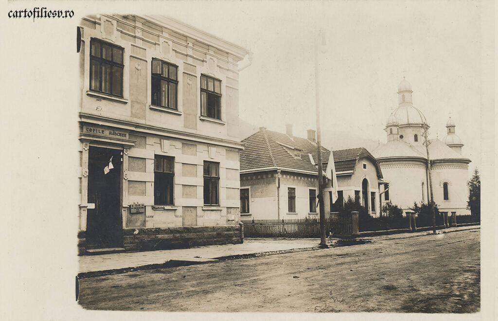 Intrarea fetelor (se observă inscripția copile – mädchen) în școala care azi poartă numele marelui Bogdan-Vodă. Se observă gardul din fier forjat (cu model unic) de la casa parohială, biserica Sf. Nicolae și parc.