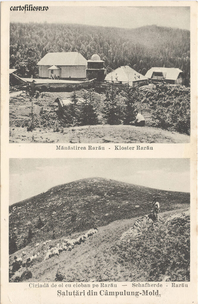 Salutări din Câmpulung Mold. Mănăstirea Rarău – Kloster Rarău / Ciriadă de oi cu cioban pe Rarău – Schafherde Rarău.