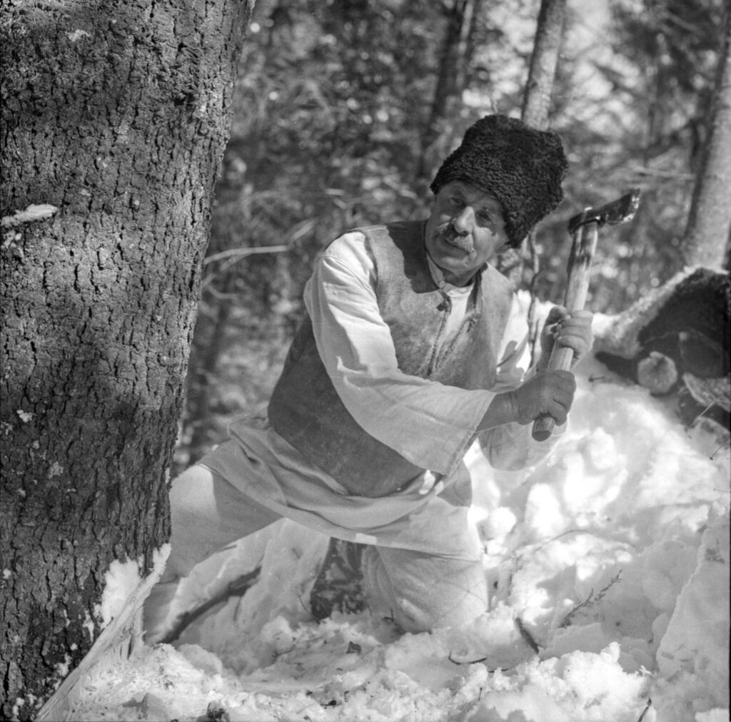 Meșterul Mihai Lăcătâș, într-un februarie geros, tăind un molid de rezonanță, sub Rarău.