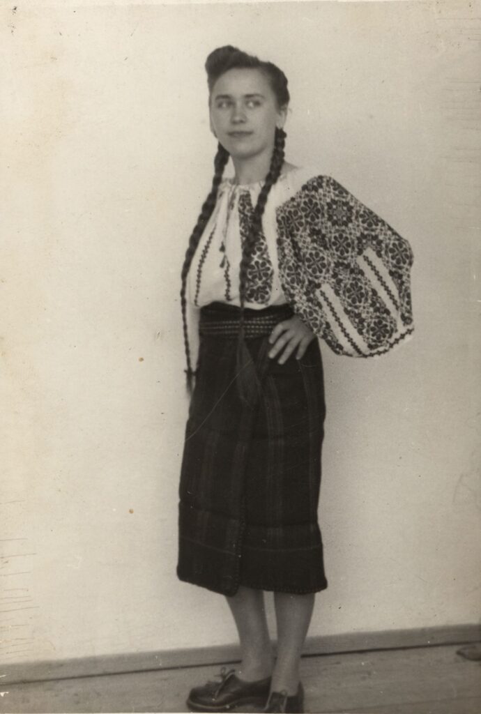Huțancă tânără în costum de sărbătoare, vara, în Moldovița (Hojda)