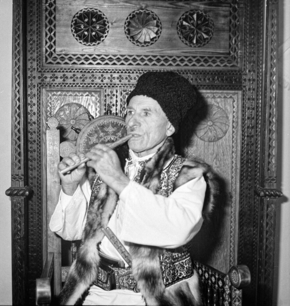 Rapsodul popular Ilie Cazac (sau Cazacu, cum i-au zis cei de la Electrecord), în Muzeul Arta Lemnului, pozând pentru coperta discului său.