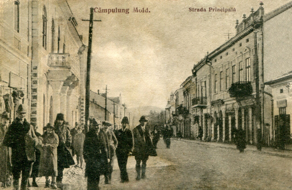 Locurile sunt aproape neschimbate față de perioada austro-ungară: pe dreapta, “Bodega” lui Abraham Schieber și puțin mai jos, hotelul lui Anton Rothkogel. Carte poștală donată colecției MAL de d-na Marcela Topertzer.