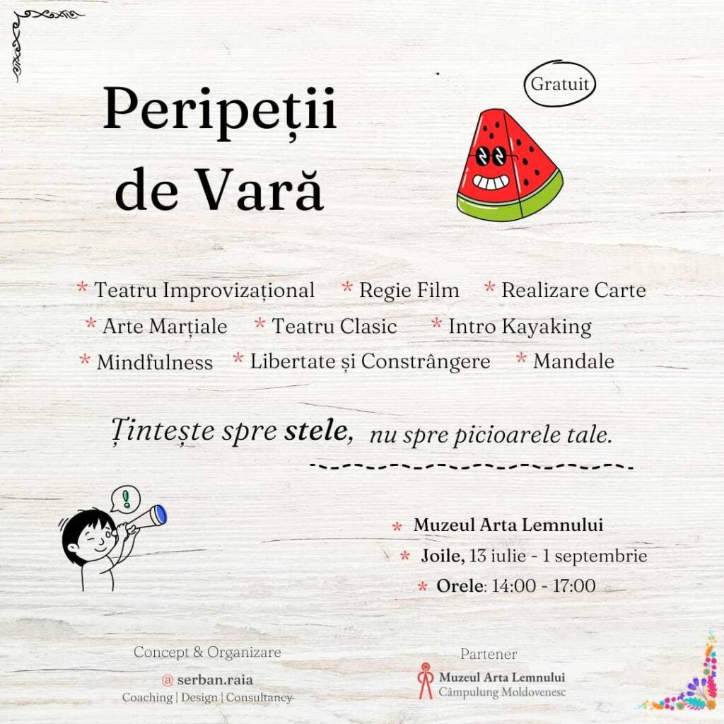 Pentru că el este mereu acolo să ne ofere o mână de ajutor sau, mai bine zis, o ramură de ajutor. Vă invităm să veniți alături de noi să reflectăm la nenumăratele moduri în care lemnul a modelat viețile noastre, dar și să experimentăm prin activități ludice apropierea noastră față de lemn. Pe perioada celor patru zile de ateliere, vom descoperi, într-un mediu plăcut, importanța lemnului în viața noastră cotidiană prin jocuri interactive, prin dezbateri, prin exerciții teatrale și prin activități creative. 1 august / Grupa de copii 8-12 ani – 14:00-16:00 2 august / Grupa de 13-18 ani – 14:00-16:00 3 august / Grupa de copii 8-12 ani – 10:00-12:00 Grupa de 13-18 ani – 14:00-16:00 4 august / Grupa de copii 8-12 ani – 14:00-16:00 Grupa de 13-18 ani – 14:00-16:00 Locație: Muzeul Arta Lemnului Campulung Moldovenesc; Perioadă: 01-04 august 2023; Durată atelier: 2 ore (3 ateliere per categorie de vârstă); Categorii de vârstă recomandate: copii (8-12 ani) și adolescenți (13-18 ani); Grup atelier: 10-20 participanți; Investiție per atelier: 60 Ron (materiale incluse); Formatori: Laura Anca Ghiuru și Luminița Pîrlea Pentru înscrieri și informații suplimentare puteți suna la: 0726 911 448 / 0726 518 165 sau trimite mesaj la adresa de e-mail:lp.edludis@gmail.com Termen limită de înscriere: 28 iulie 2023 Descoperă alte postări de la Muzeul Arta Lemnului: Carusel de EVENIMENTE, Vara 2023 Expoziție temporară de Mélody Boulissière 07 iulie 2023 – 18:00 30 iunie 2023 – 19:00